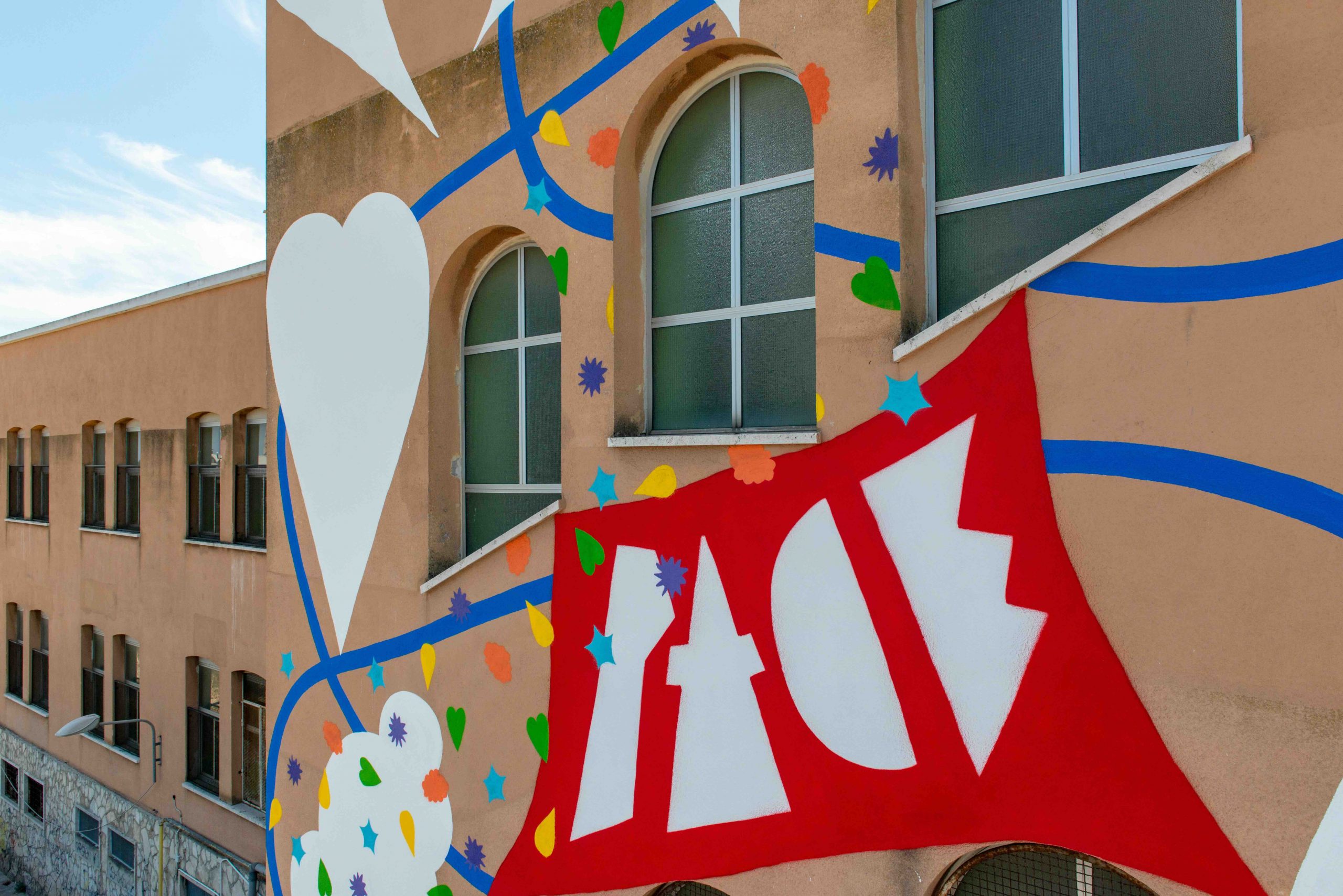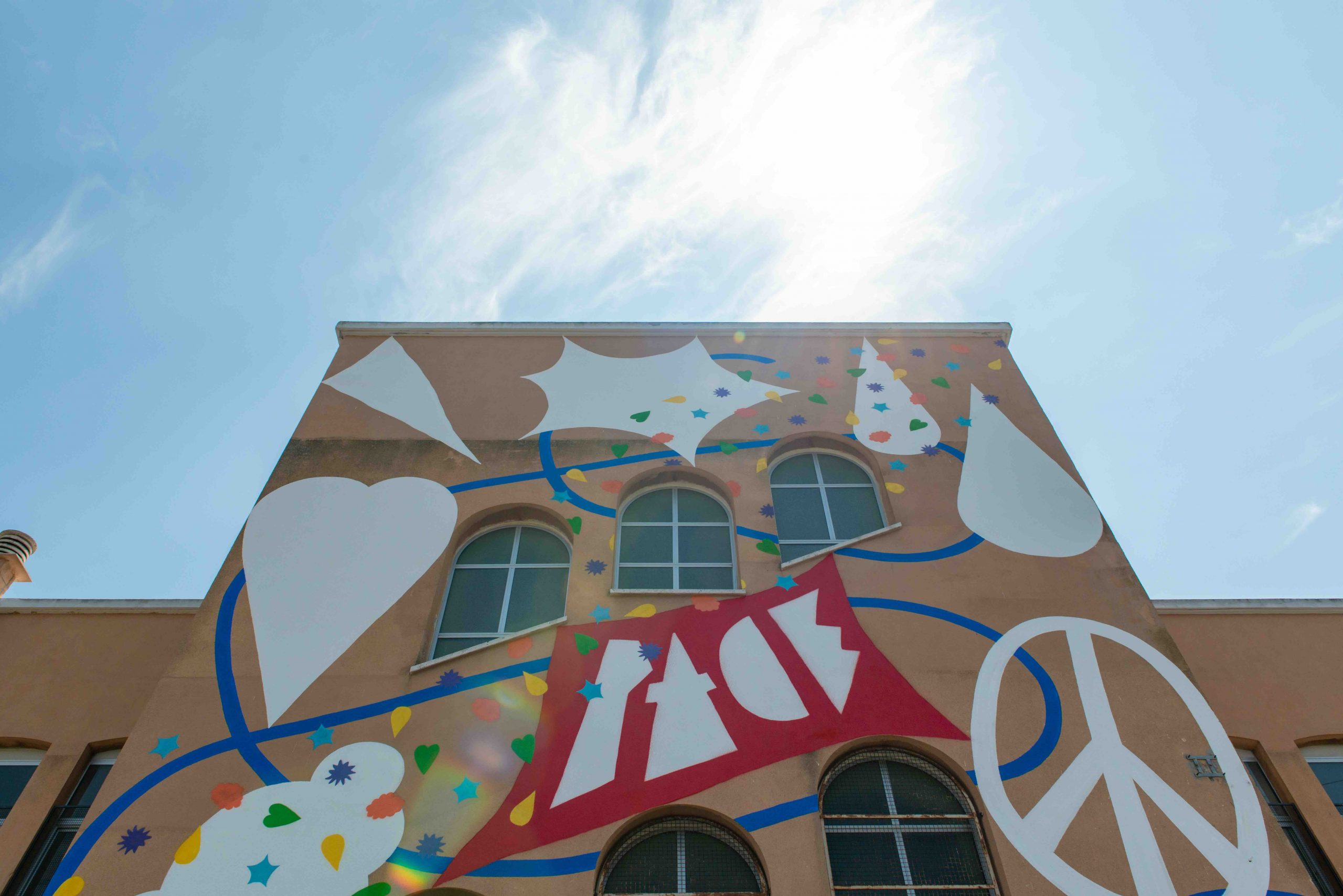 Nuvole, pioggia, bandiere, stendardi, coriandoli, cuori e simboli della pace. Ispirandosi alla sintesi di Munari, il risultato è una valorizzazione dell’istinto grafico, capace di integrarsi ai murales pre-esistenti nella loro semplicità e solidità espressiva.